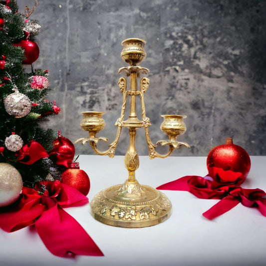 Elegant Brass Vintage Candle Holder - Triple Arm, 8" Tall