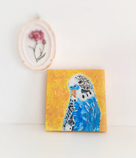 Handmade Acrylic Painting – Parrot & Bluebird, 3D Effect, 4" Square Art
